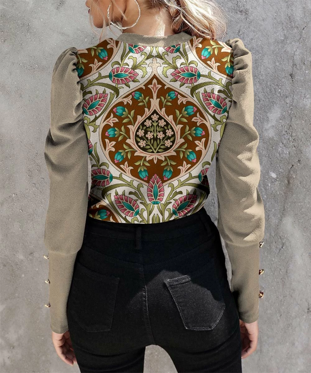 This mutton-sleeve top is designed with button accents and a crew neckline.