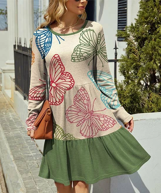 Add an inspiring touch to your ensemble with this drop-waist dress featuring a lovely butterfly design crafted in a lightweight material.