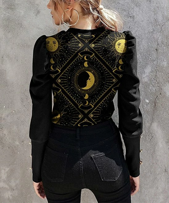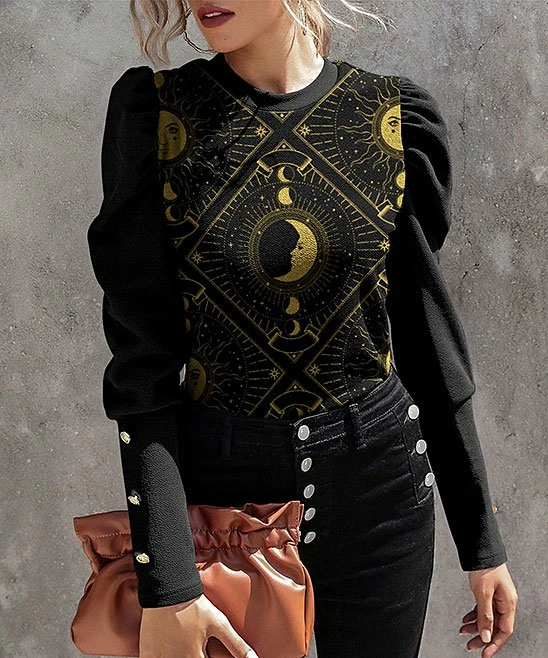 Add drama to any look with this lightweight top featuring a bold pattern and long puff sleeves.