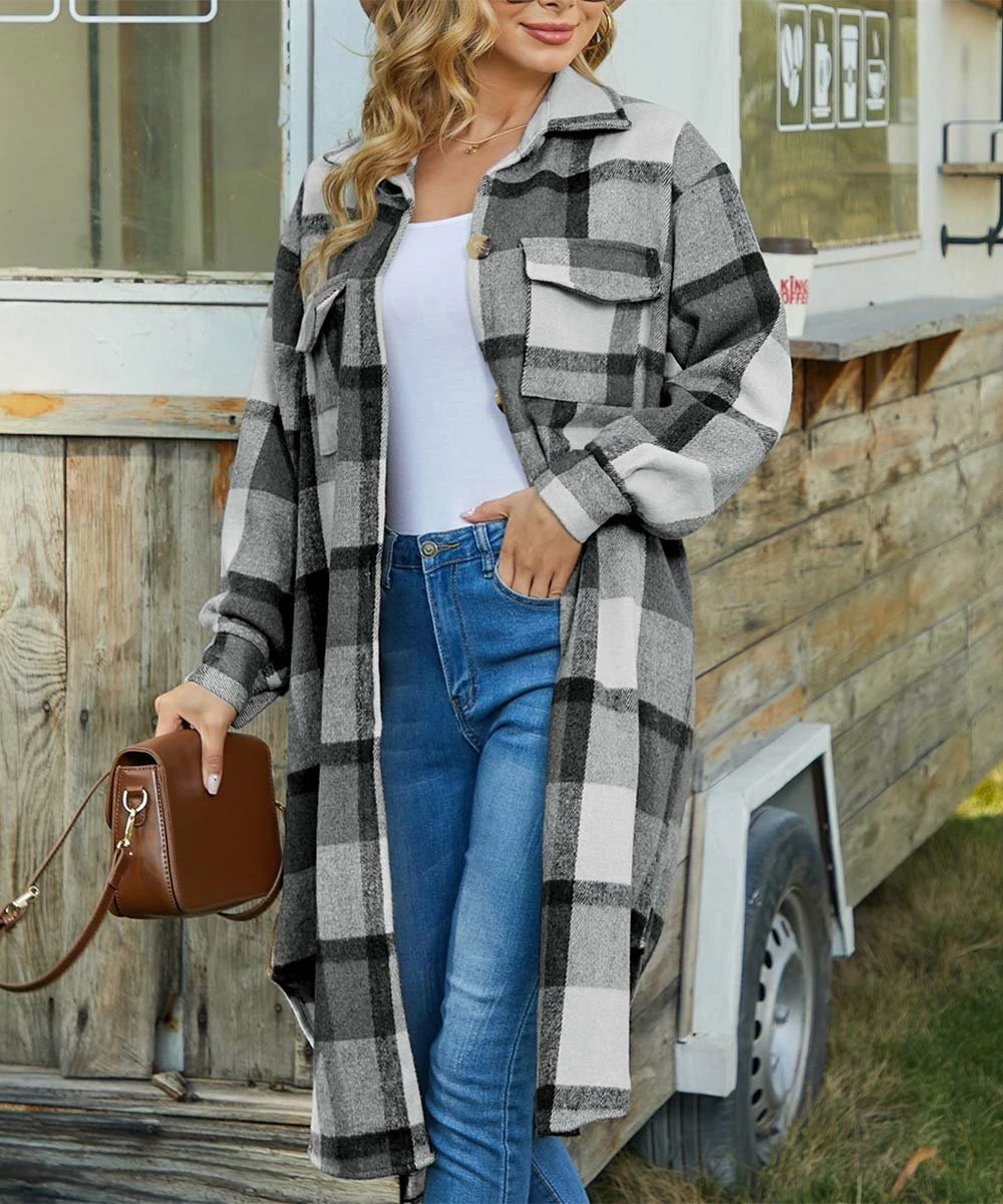 Go for a trend-right layered look in this flowy longline shacket featuring a classic buttoned front and plaid pattern.