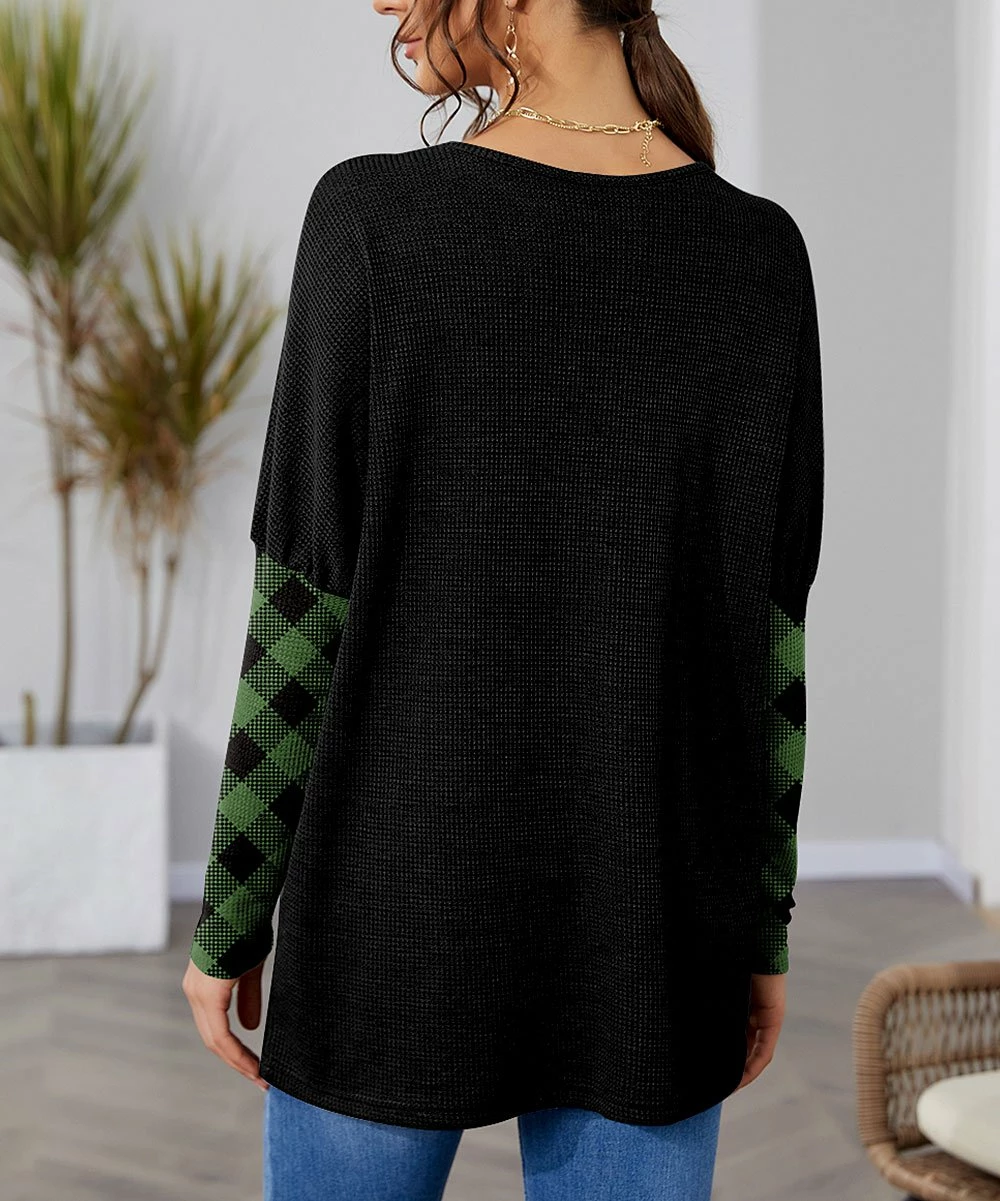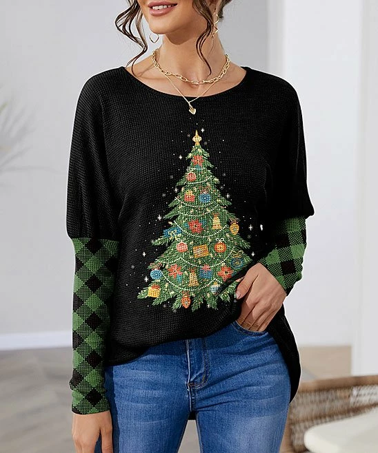 Casual bishop-sleeve tunic with a festive Christmas tree design.