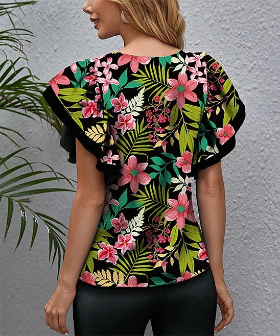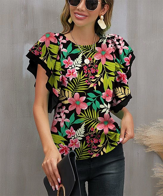 Expand your warm-weather wardrobe with this crewneck top that features double-layer butterfly sleeves.