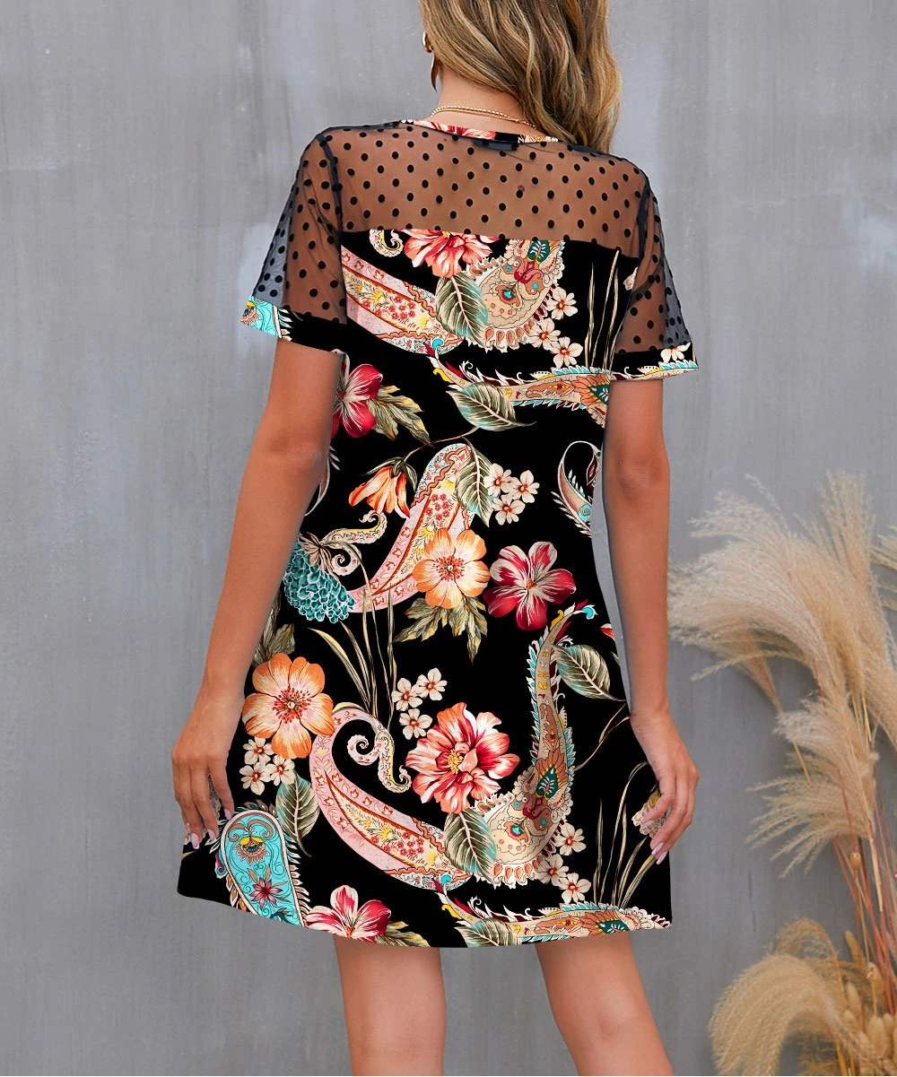 Light, stretch-infused shift dress featuring a colorful paisley print and breezy mesh accents.