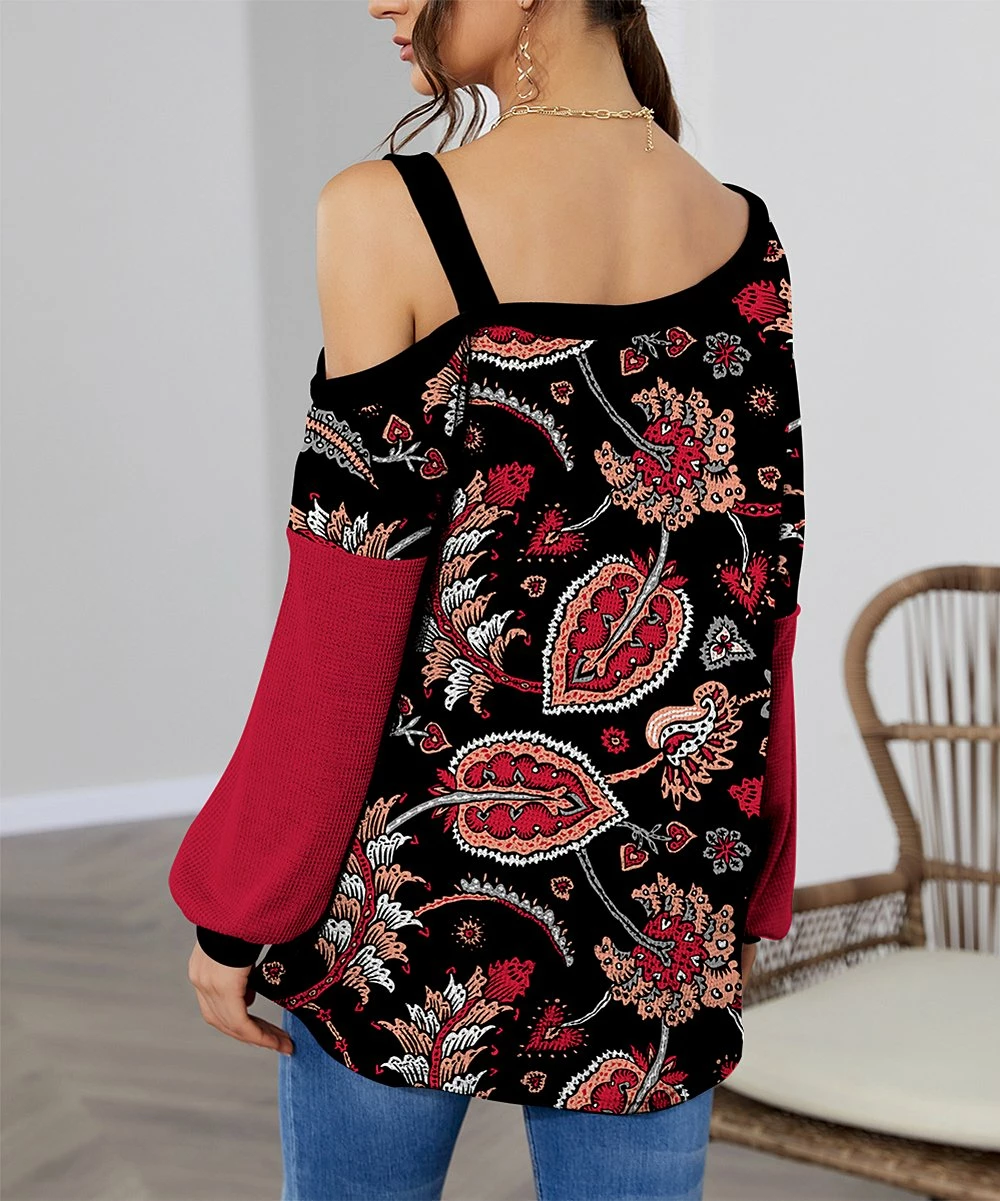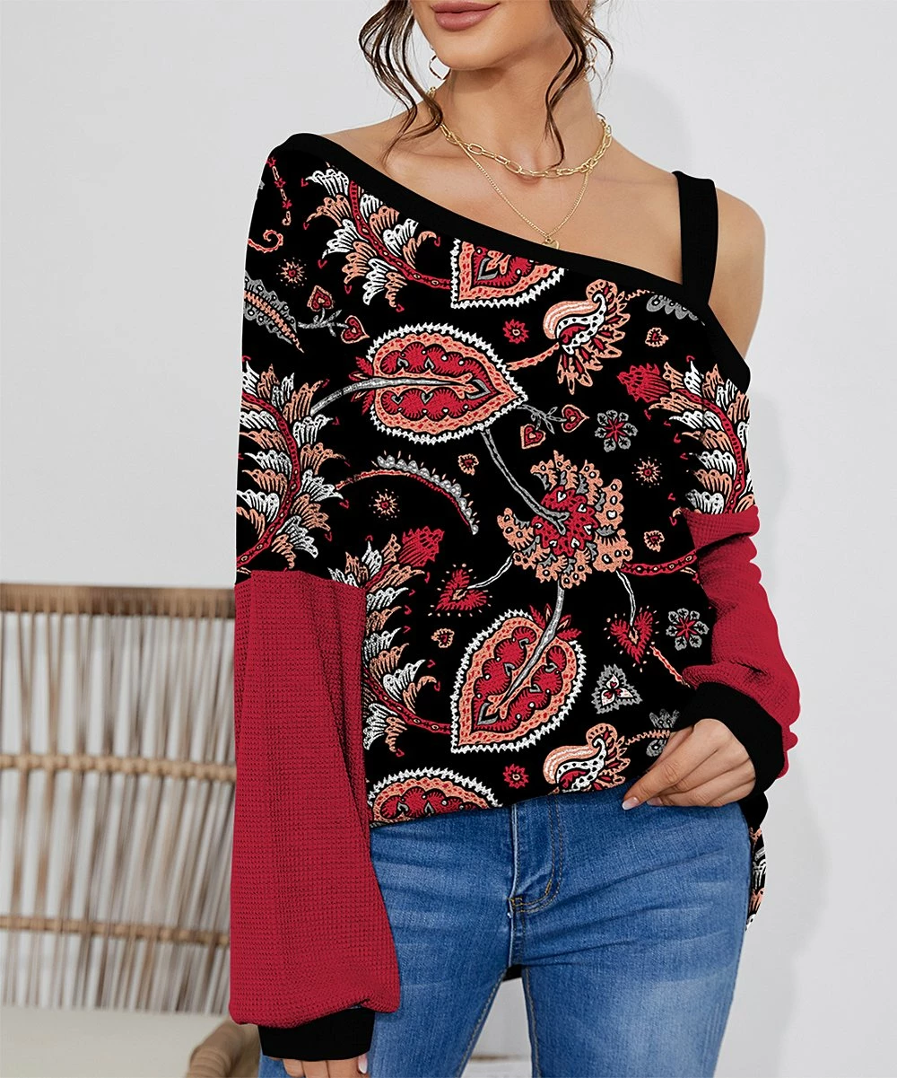 This relaxed-fit top features contrast bishop sleeves and an asymmetrical neckline. Stretch-infused fabric for all-day comfort.