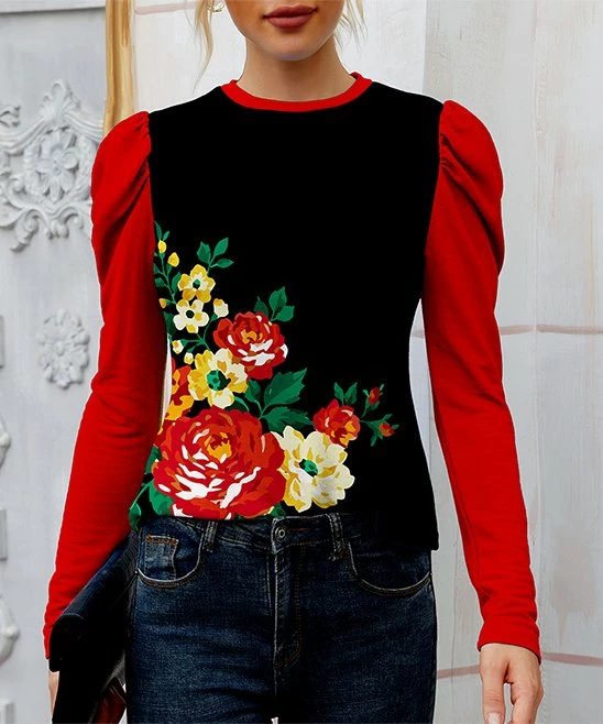 Elevate your weekend look with this romantically patterned top that keeps you comfy beneath supersoft fabric while showing off pretty puff sleeves and a sleek crewneck.
