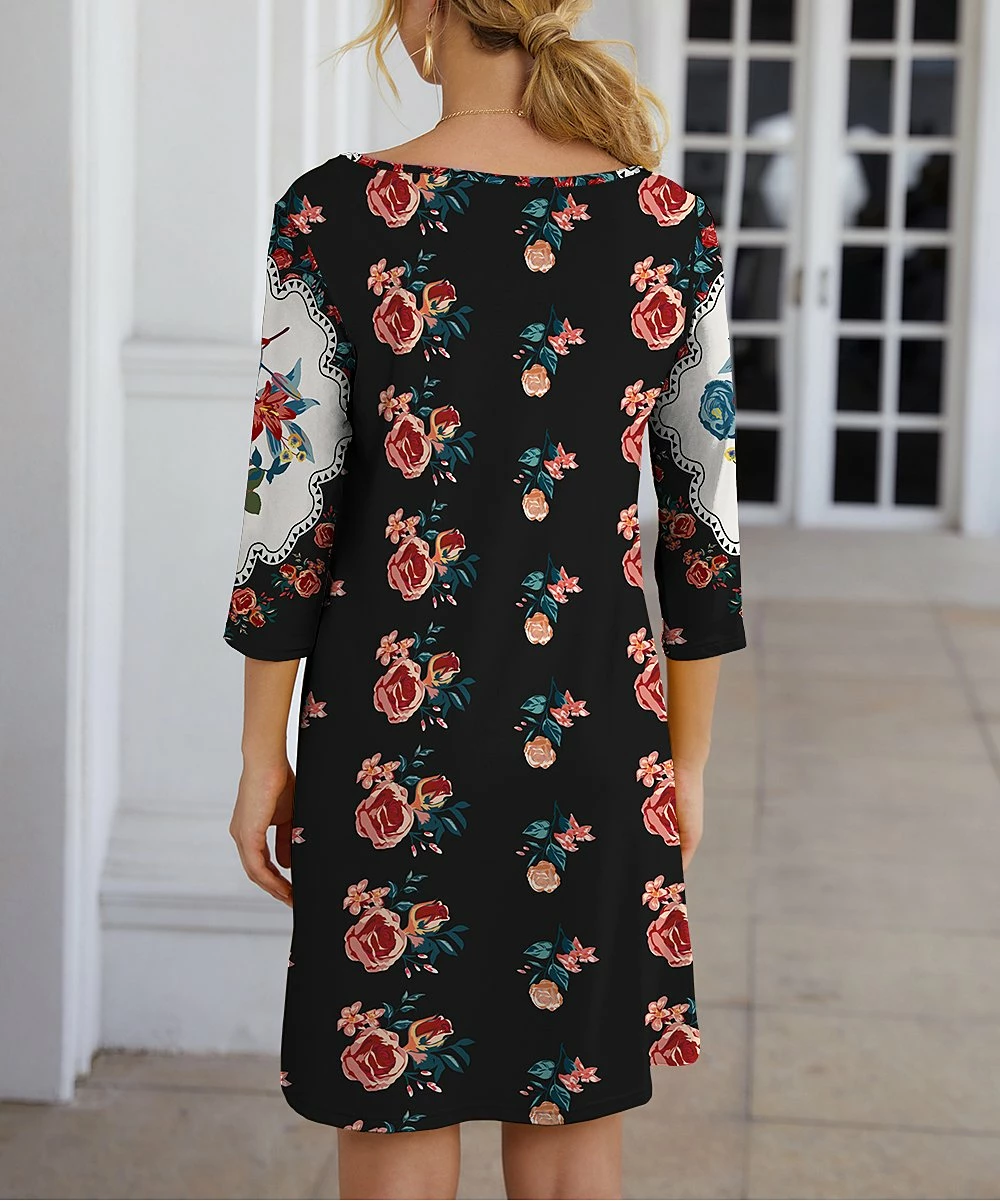 Featuring a free-flowing design, stylish three-quarter sleeves and a gorgeous pattern, this shift dress is an essential addition to your casual closet.