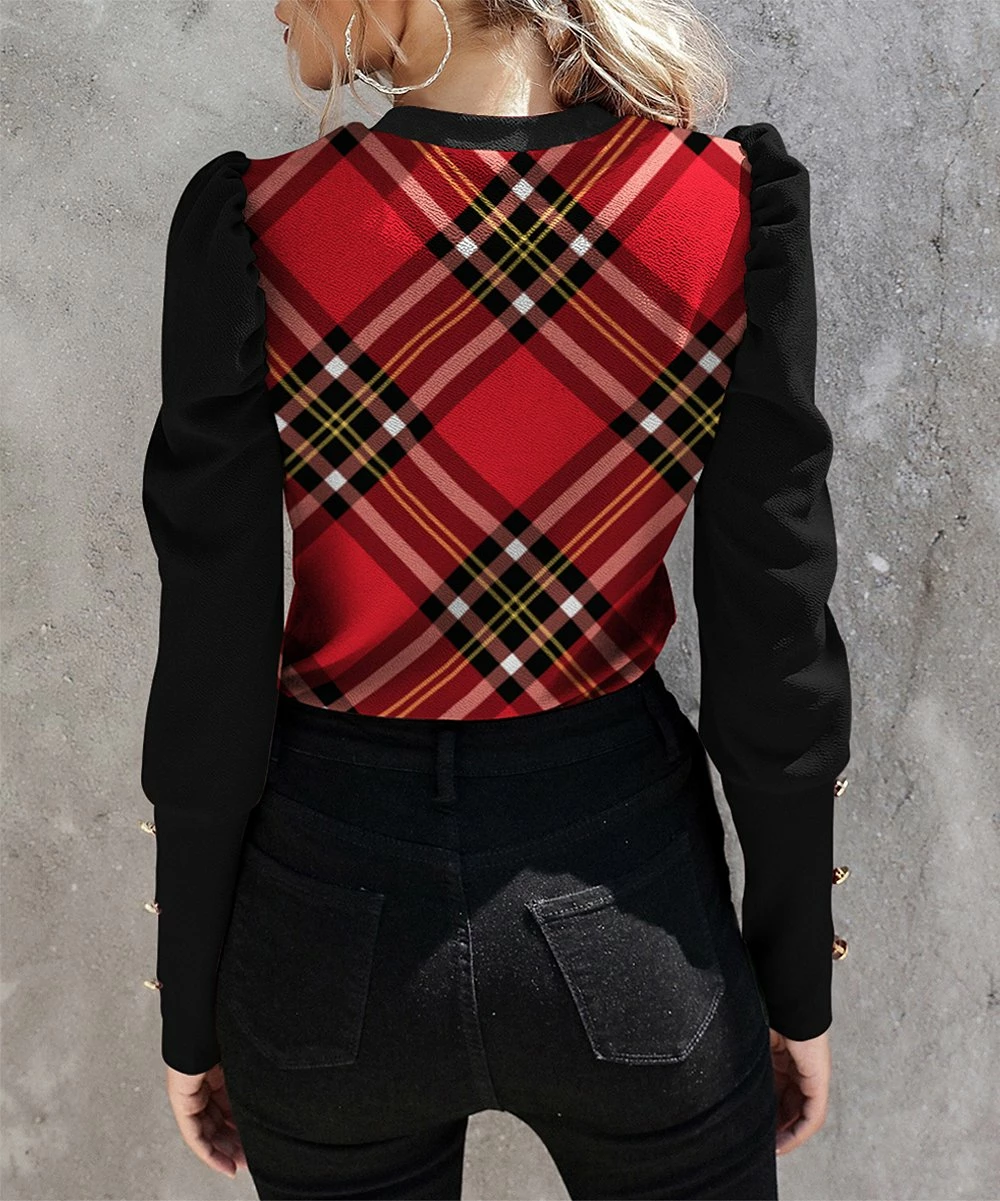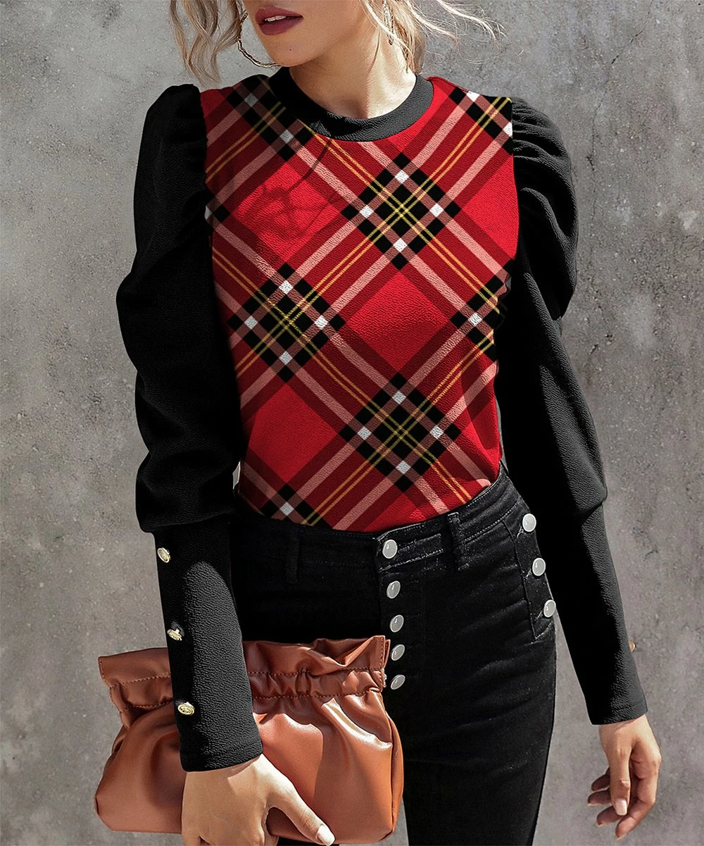 This puff-sleeve crewneck top features stylish button accents and a classic pattern that makes it a great addition to any ensemble.