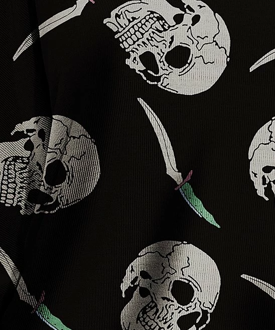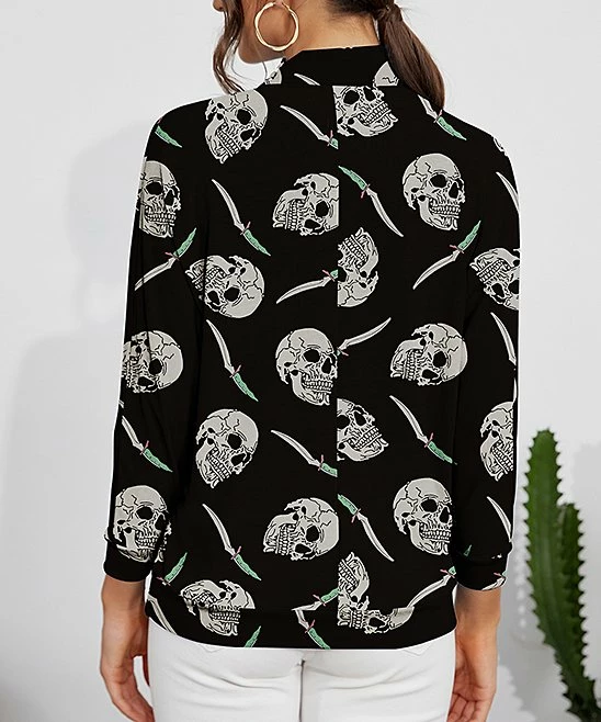 A skull and knife pattern with cutout neckline makes this top a dramatic addition to ensembles.