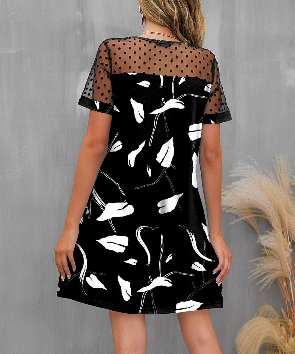 A sheer mesh-accented upper with polka dot pattern gives personality to this abstract-printed shift dress.