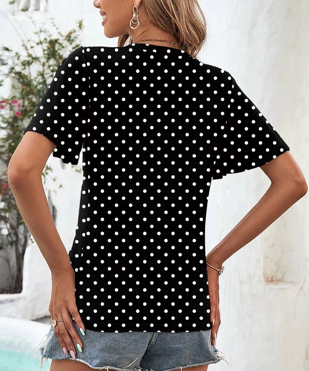 Short bell sleeves bring chic flow to this print v-neck top composed of stretch-enhanced fabric.