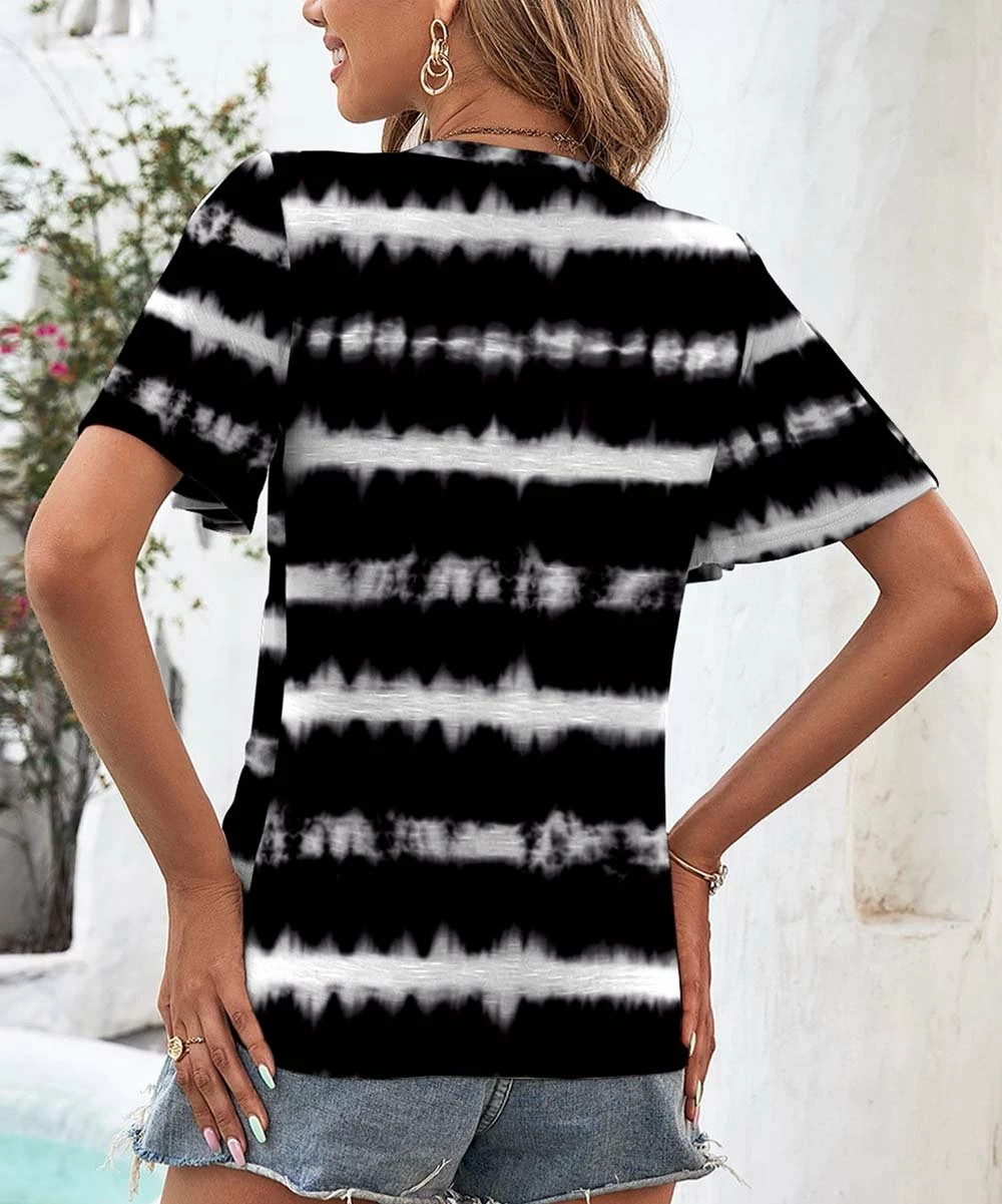 Short bell sleeves bring chic flow to this print v-neck top composed of stretch-enhanced fabric.