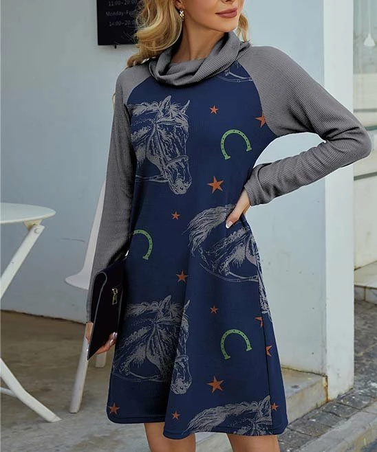 Give your weekend look a whimsical giddy-up with this dress that flaunts a fun print on textured waffle-knit fabric. A softly draped cowl neck and long sleeves keep you cozy while you mosey through your day.