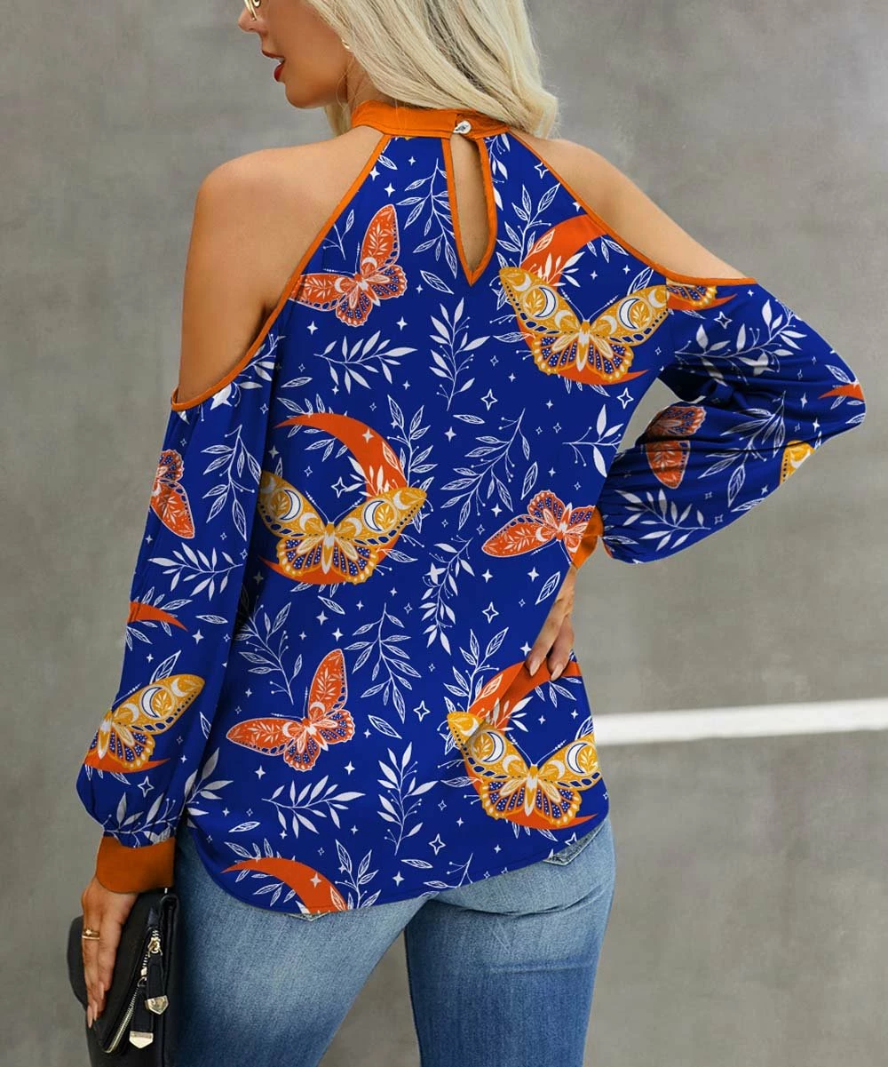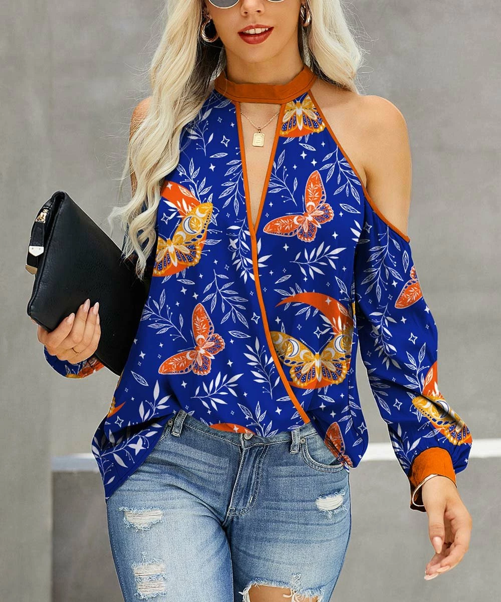 High-neck surplice top made with stretch-infused material and shoulder cutouts.