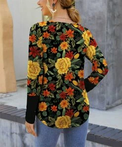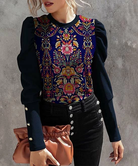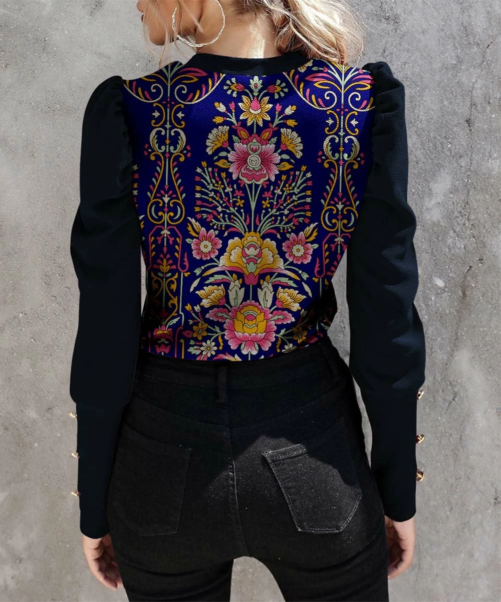 This bold printed top calls attention to the balloon sleeves with contrasting button details.