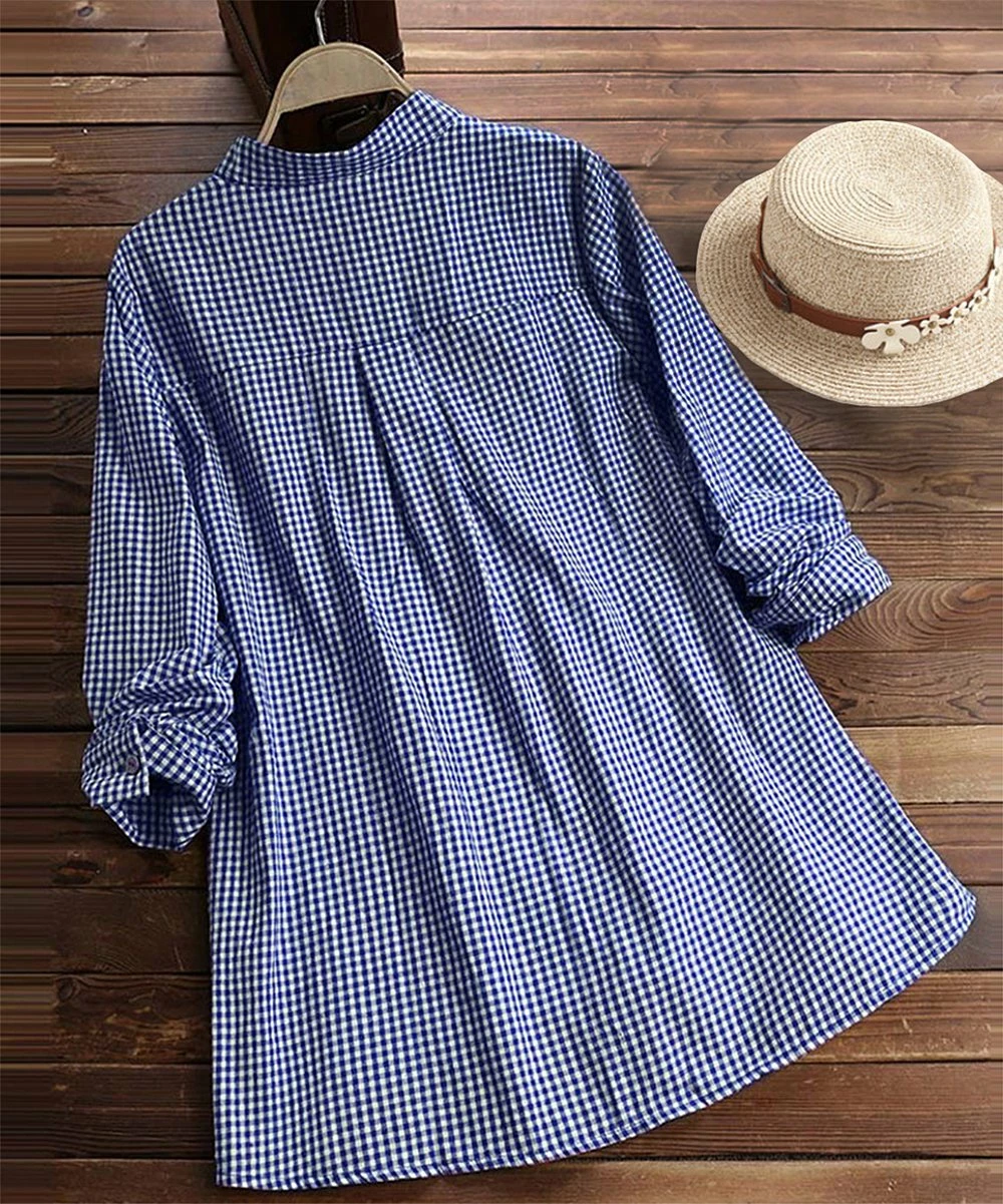 Enliven your style with this plaid hi-low top featuring an adjustable buttoned front and long sleeves for coverage.