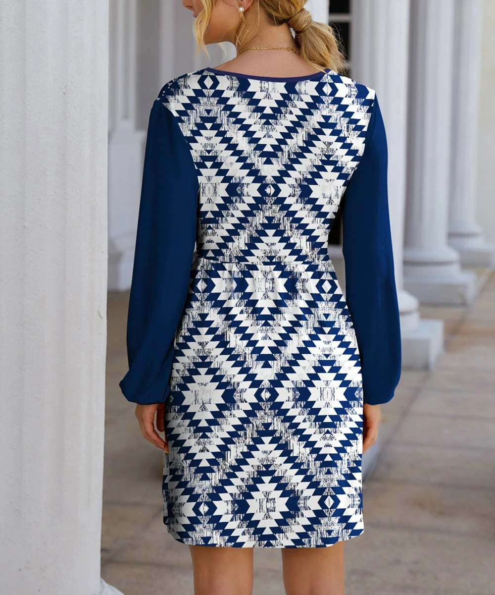 This surplice dress features a vibrant geometric print and form-flattering empire waist, making it a versatile choice day or night.