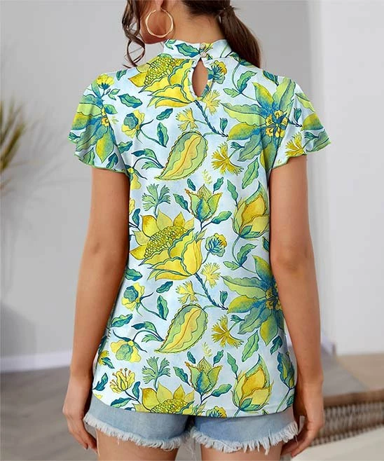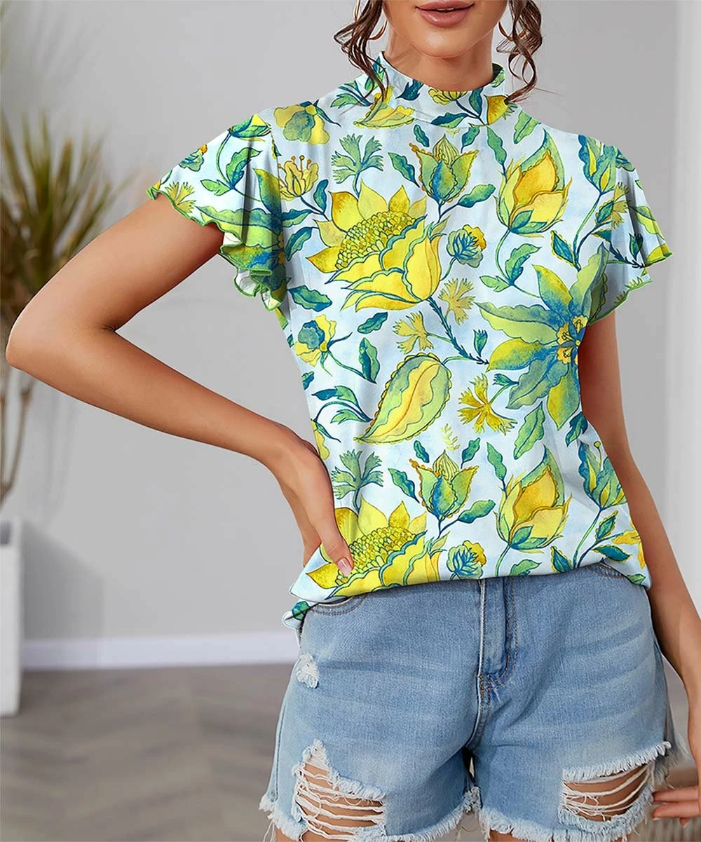 Light, stretch-infused top featuring a colorful floral print, mock neckline and flutter sleeves.