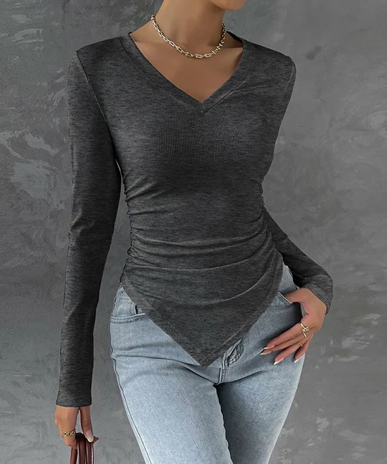 This v-neck top features a classic color and a stylish triangle hem with a hint of stretch for all-day comfort.