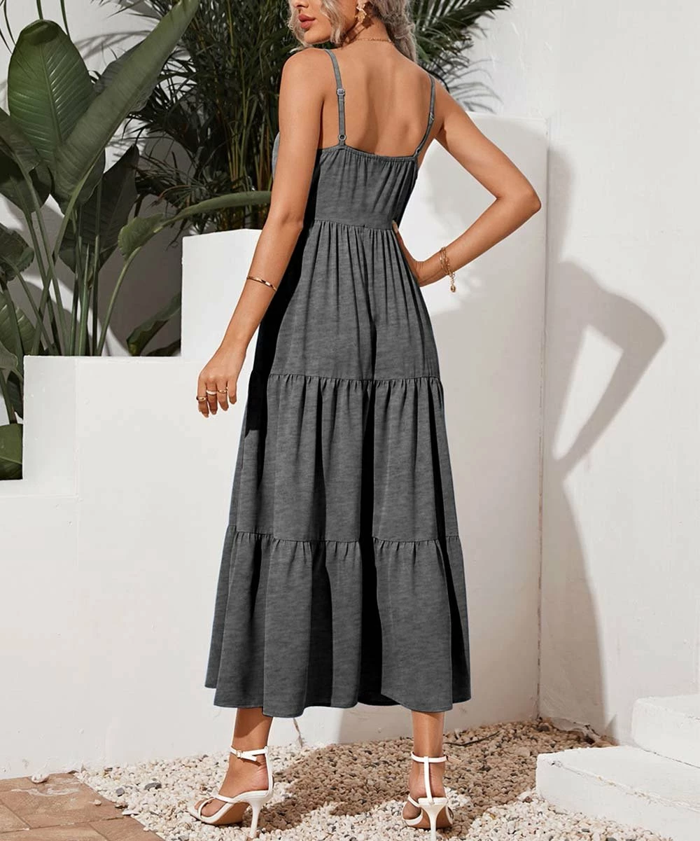 With a tiered skirt, sleeveless top and rich hue, this lightweight maxi dress brings playful movement and stretch-enhanced comfort to your everyday look.
