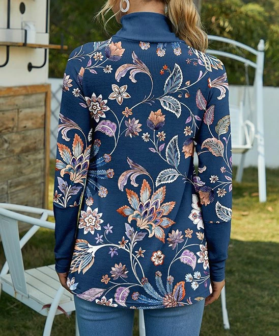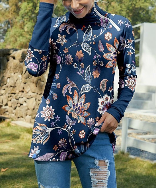 This turtleneck pairs a solid at the cuff and neck with a bold print and then adds a zipper detail for added intrigue.