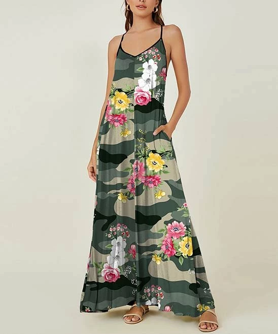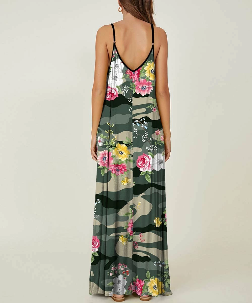 Welcome warm weather in the flowing style of this sleeveless maxi dress boasting a camouflage floral print and v-neckline.