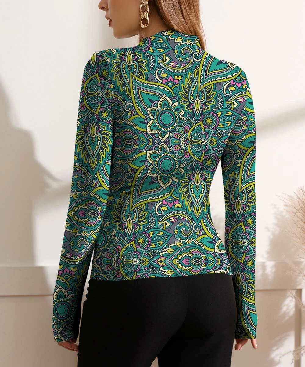 Long-sleeve top featuring a vibrant floral print, elegant ruching across the front and stretch-infused fabric.