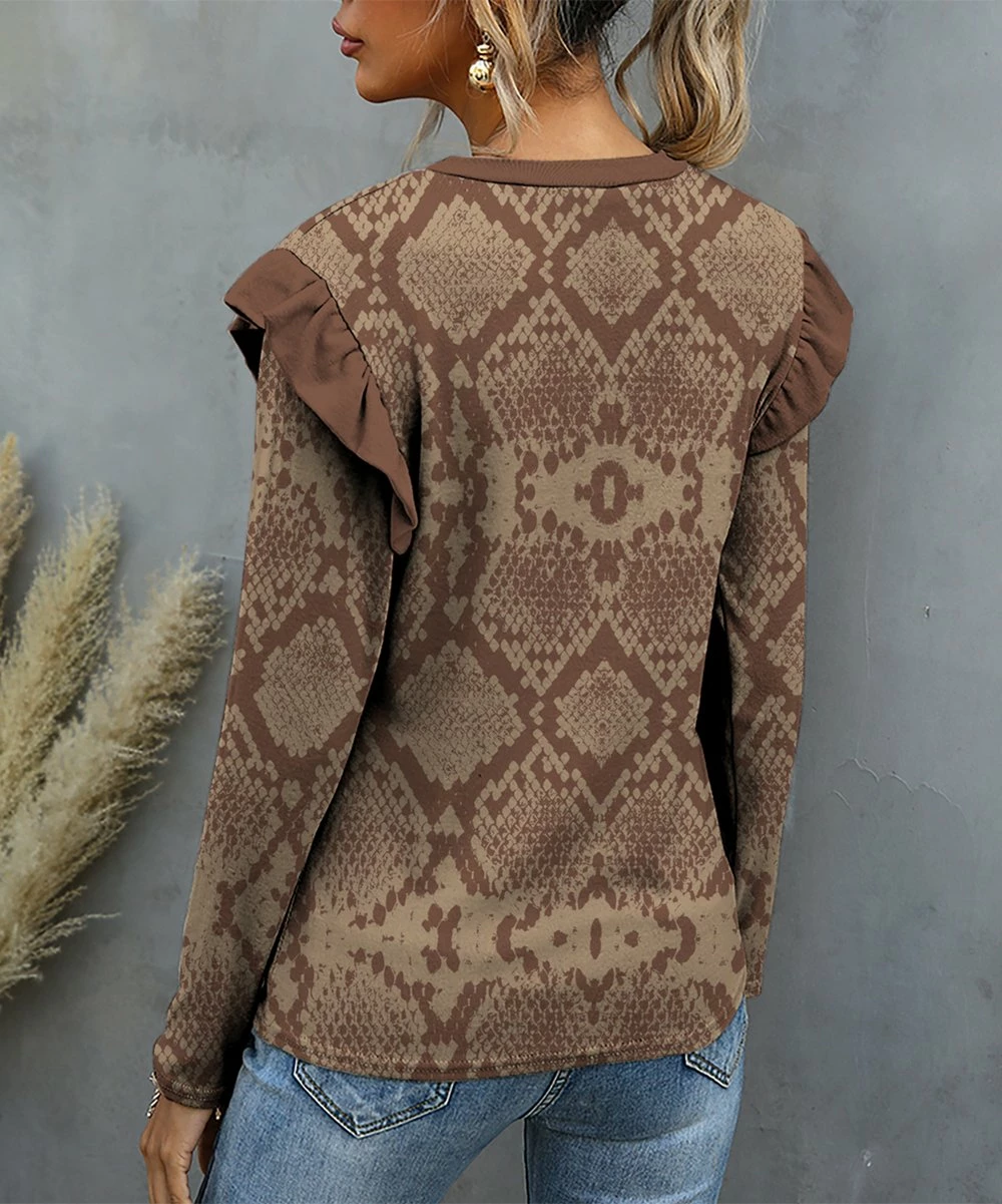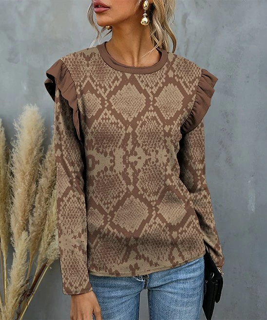 Slither some style into your work-to-weekend wardrobe with this snake-print top featuring ruffled shoulders and stretchy knit fabric for comfortably fashionable wear you can pair with jeans or leggings.
