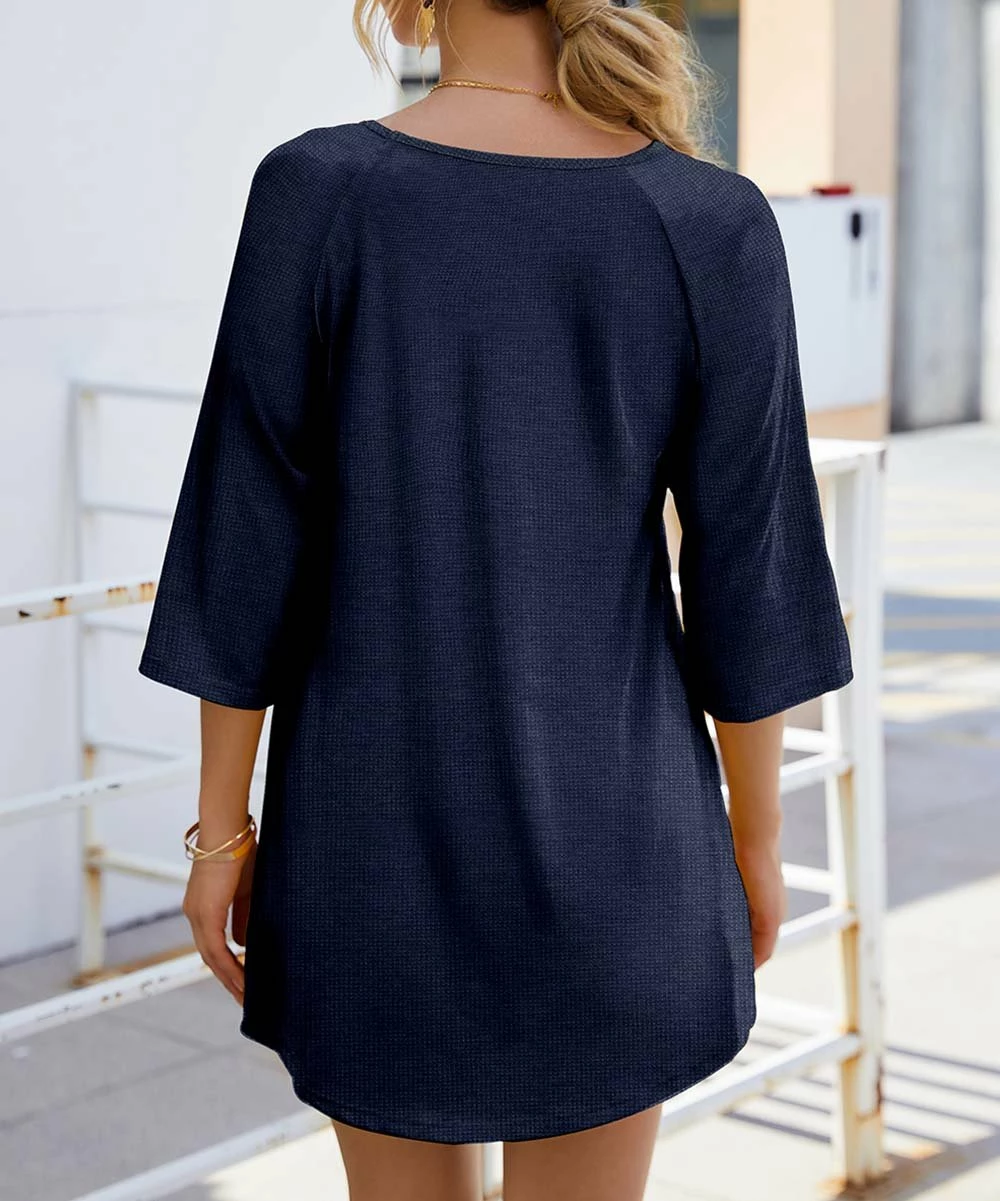 The v-neckline on this raglan-sleeve tunic becomes a focal point with the crisscrossing straps and lightweight fabric has a touch of stretch for an easy fit.
