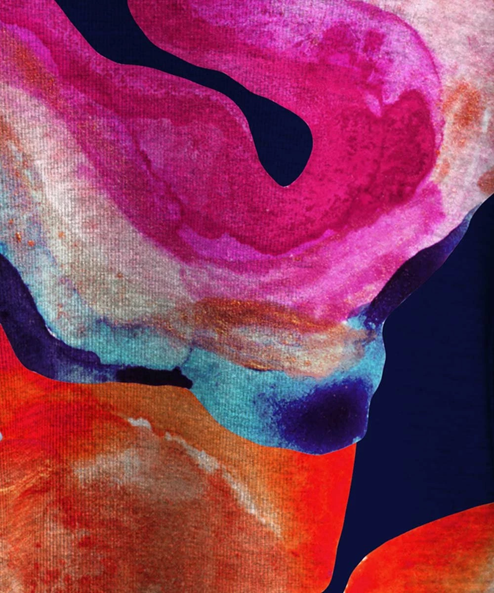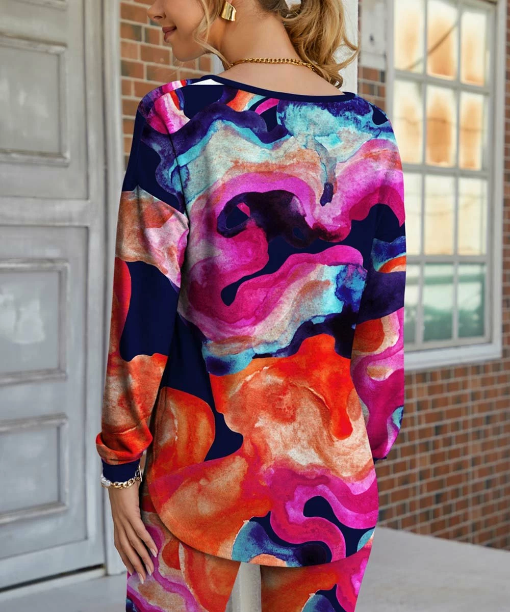- Includes navy and orange abstract floral V-neck long-sleeve top and bike shorts (two pieces total)