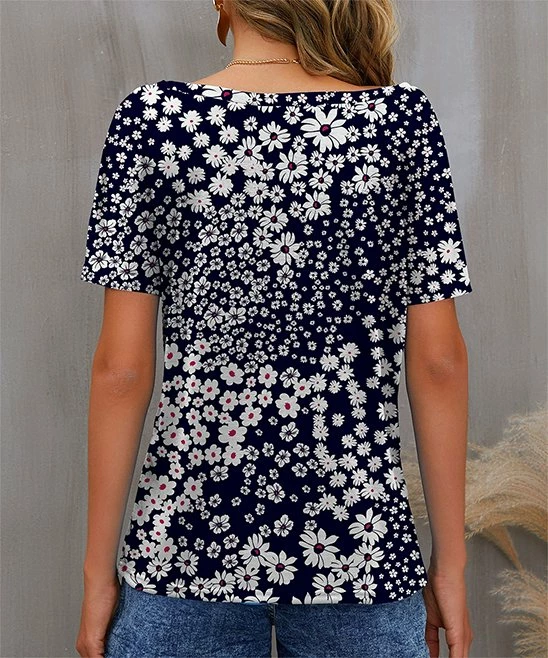 Casual short-sleeve tee with a straight boat-neckline and allover floral print.