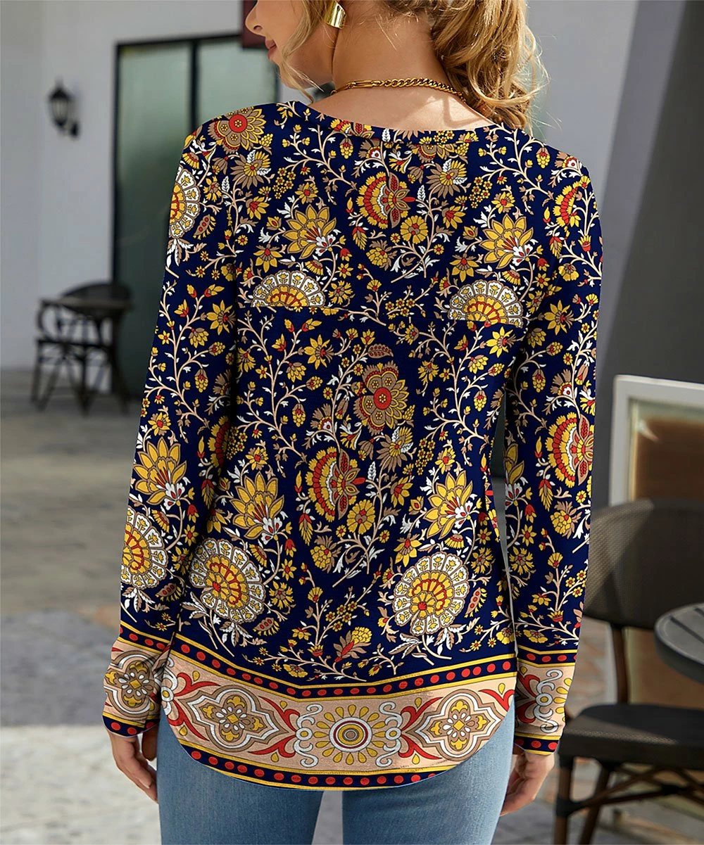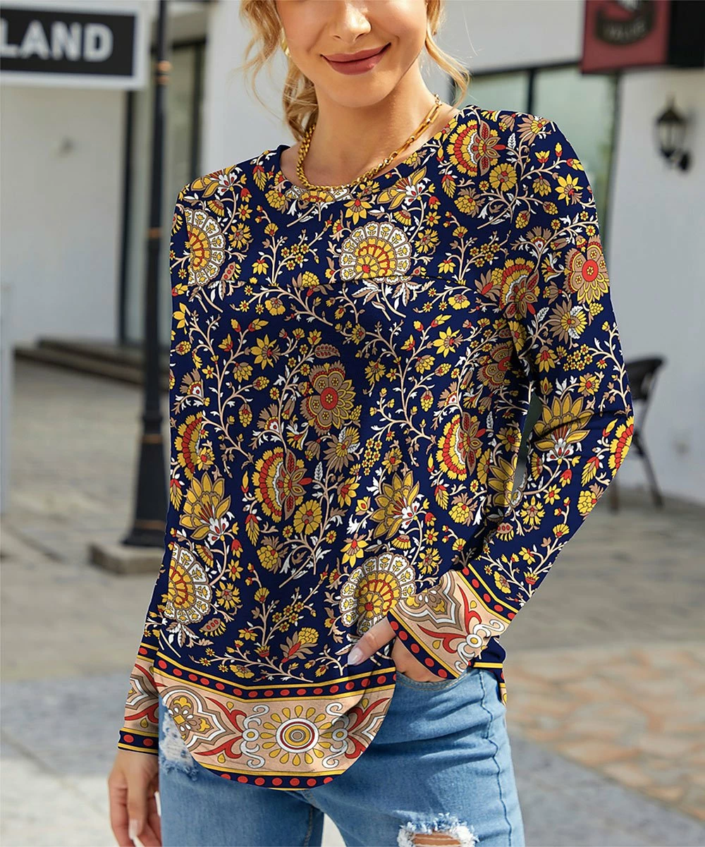 This top features a flowing fit and floral motif. Crafted from a stretch blend for flexible comfort.
