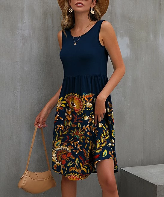 Keep it chic during warm weather outings in this empire-waist dress featuring a sleeveless cut, muted flower patterns and solid top.