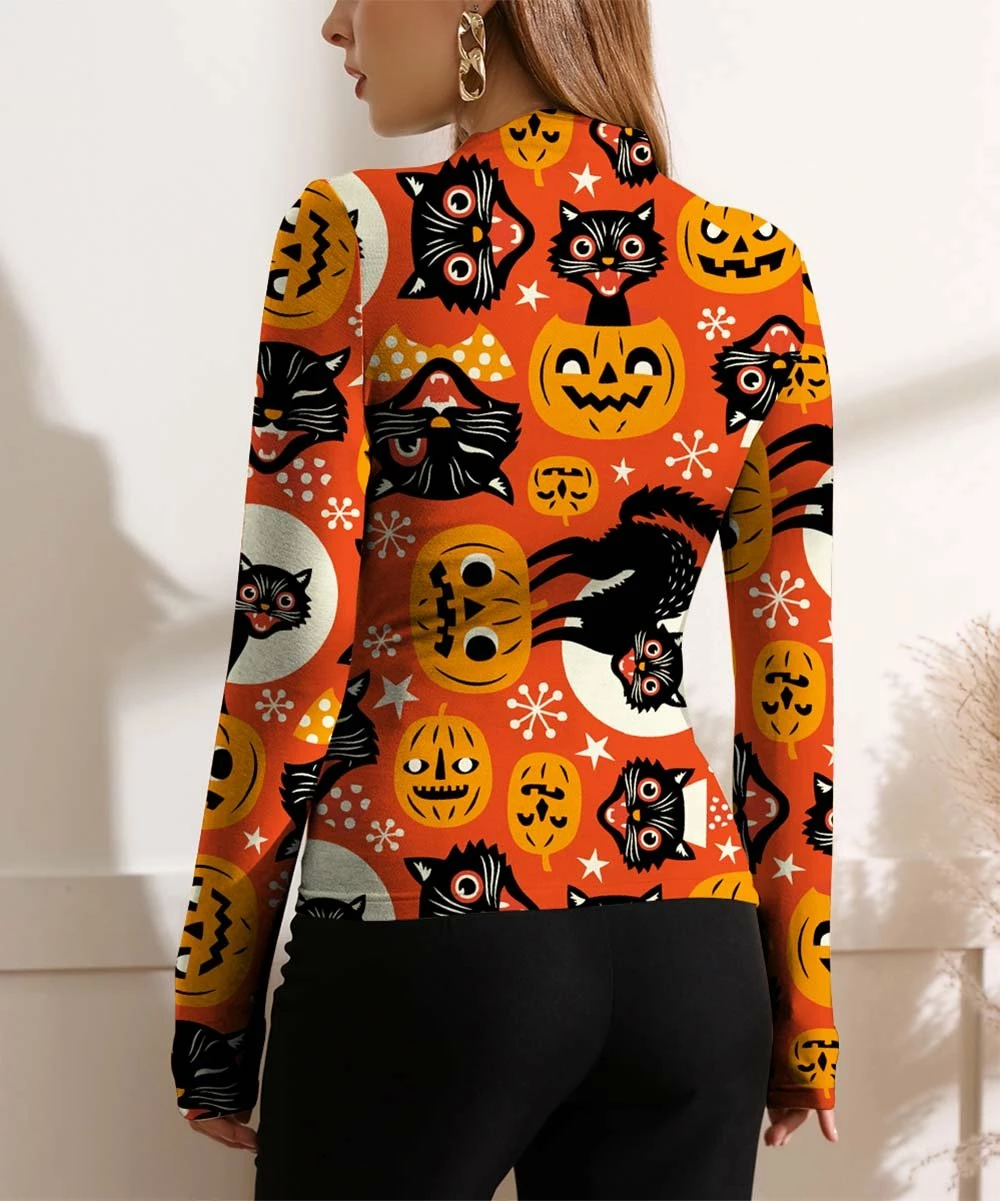 Shoulder-to-hem ruching creates diagonal pleats across this long-sleeve spooky-print top.