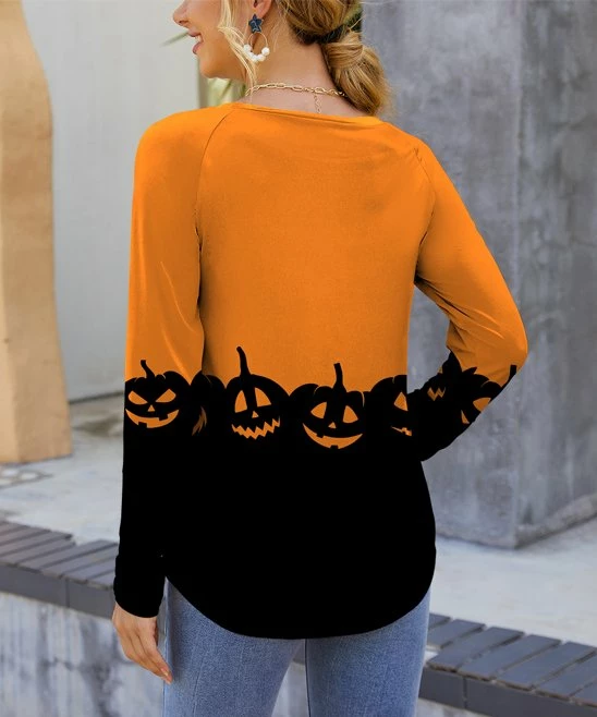 This long-sleeve top with a whimsical Halloween theme has contrasting cuffs.