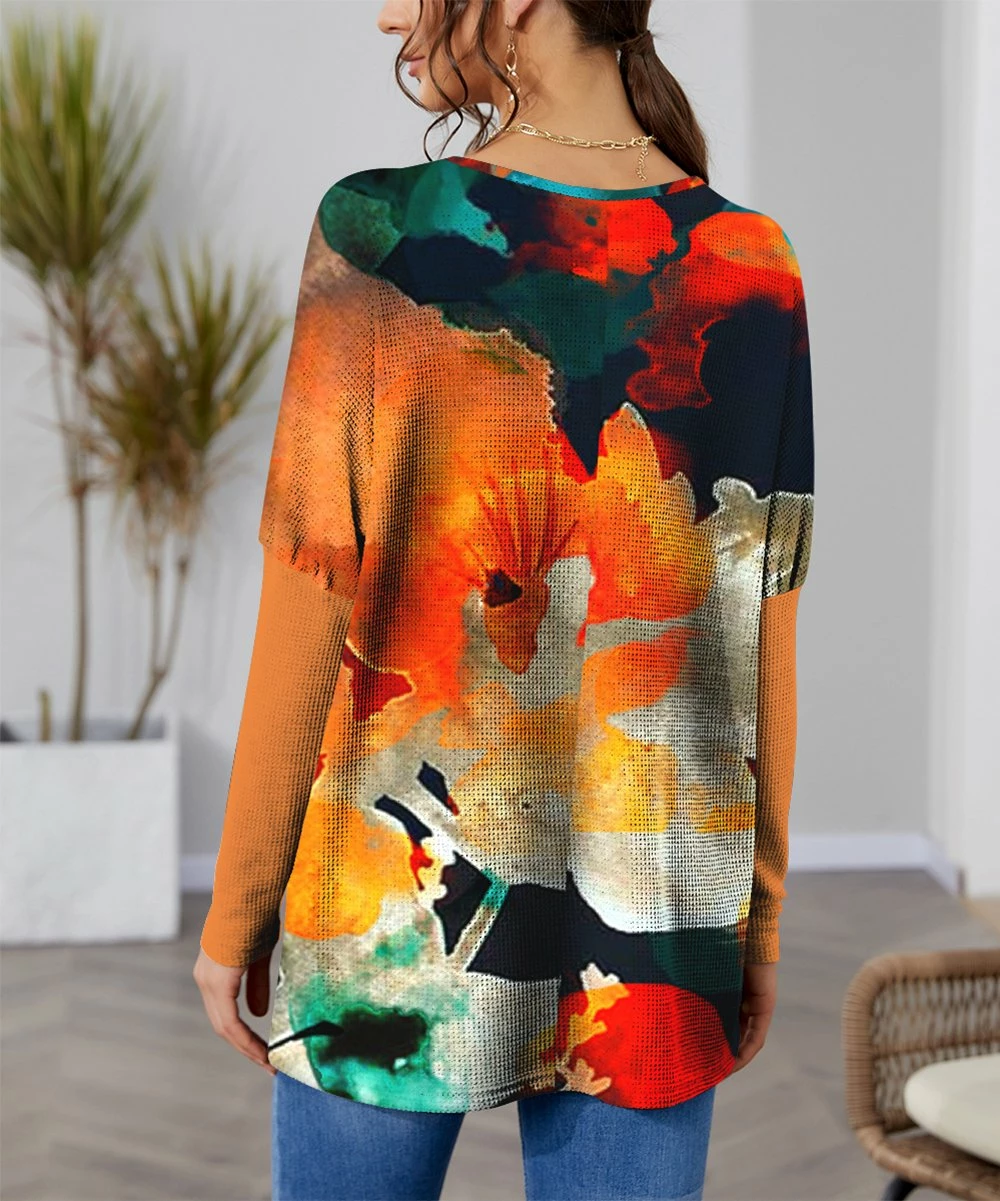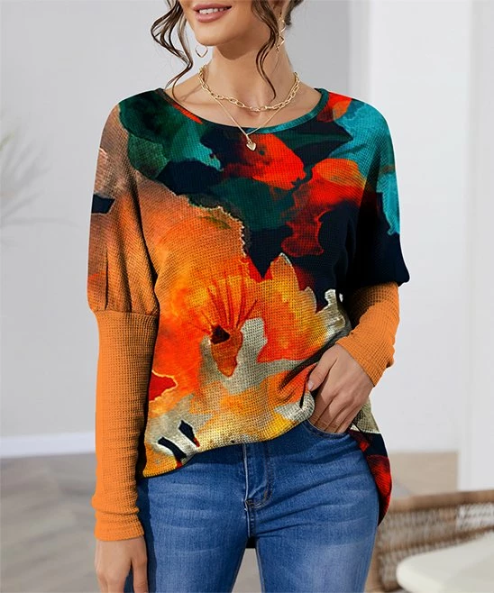 Cultivate your creative side with the lively colors and the abstract definition of this balloon-sleeve tunic made with a soft waffle-knit texture and hint of stretch in the fabric.