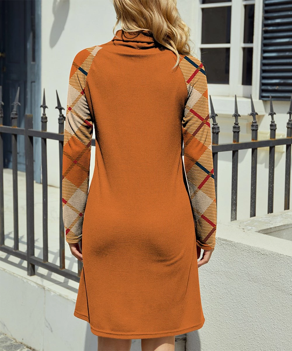 Reduce cozy dressing to a simple single step by opting for this artsy A-line dress that features long sleeves and a draped cowl neck. Stretchy waffle knit and raglan seams deliver daylong comfort.