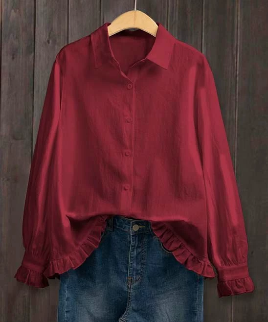 Stay comfy and cool in this ruffle-hem button-up made from a linen blend.