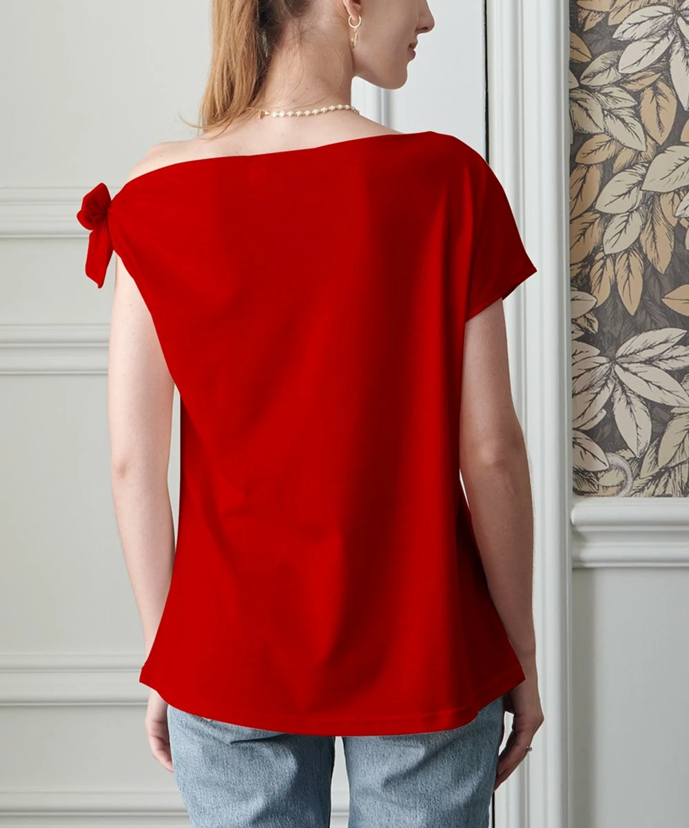 Summon second glances in this off-shoulder top featuring a tie strap detail and stretchy knit fabric for comfortably stylish wear you can dress up with skirts or down with denim.