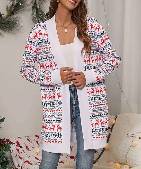 Merry flair takes shape when you add this festive geometric cardigan to your ensembles. A stretchy cotton blend lets you layer in comfort.