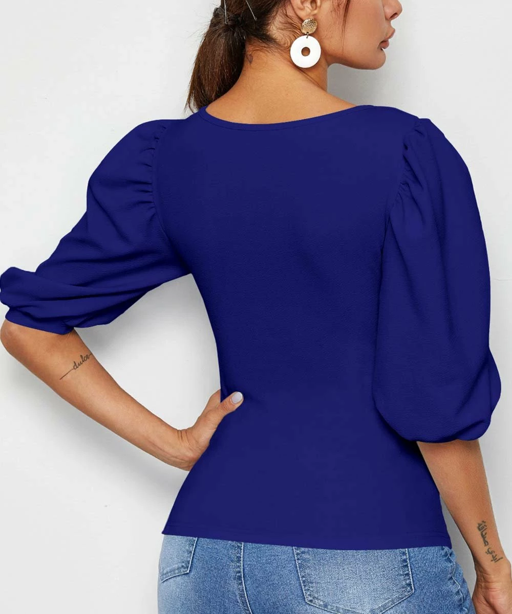 Dramatic puff sleeves pair with a square neck to create a dramatic look.