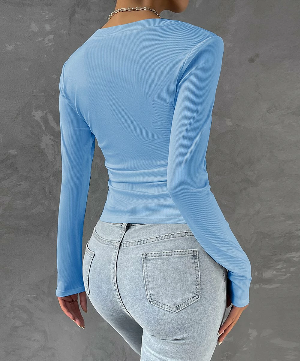 This long-sleeve top has figure-hugging ruched sides and a v-neck that’s echoed in the triangle hemline.
