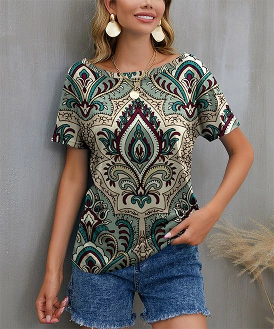Casual short-sleeve tee with a straight boat-neckline and allover geometric print.