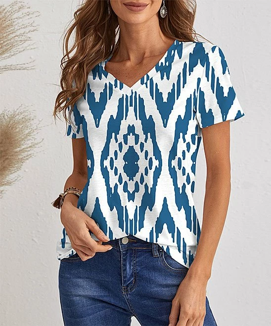 Define casual style in this v-neck tee sporting an abstract geometric print to pair with your favorite jeans or leggings.