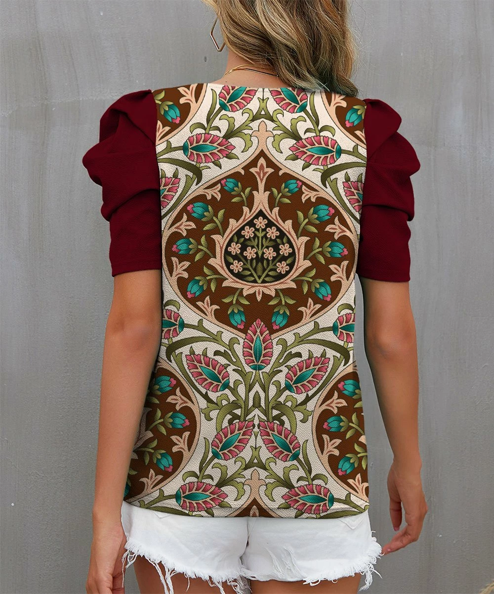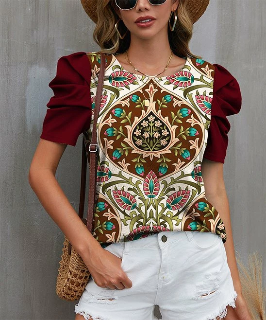 Short puff sleeves take this colorful-print crewneck top to the next level.