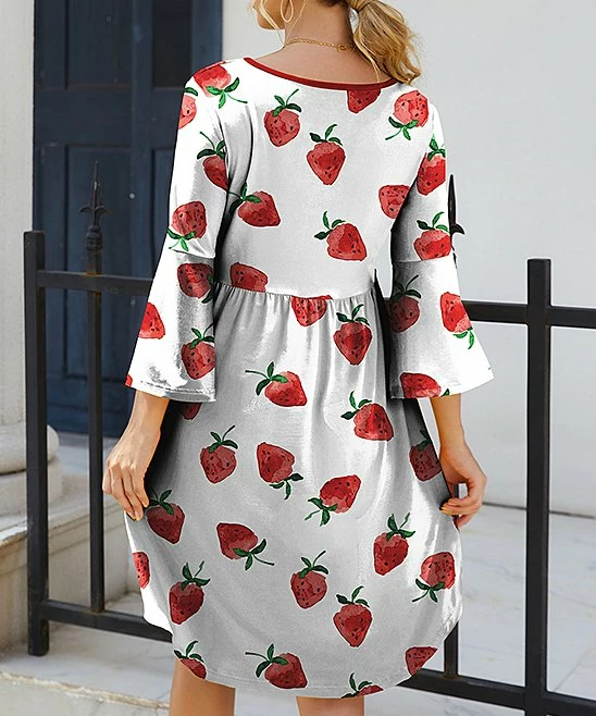 Give your wardrobe some whimsy with this empire-waist dress that features flowing bell sleeves and a sweet strawberry pattern.