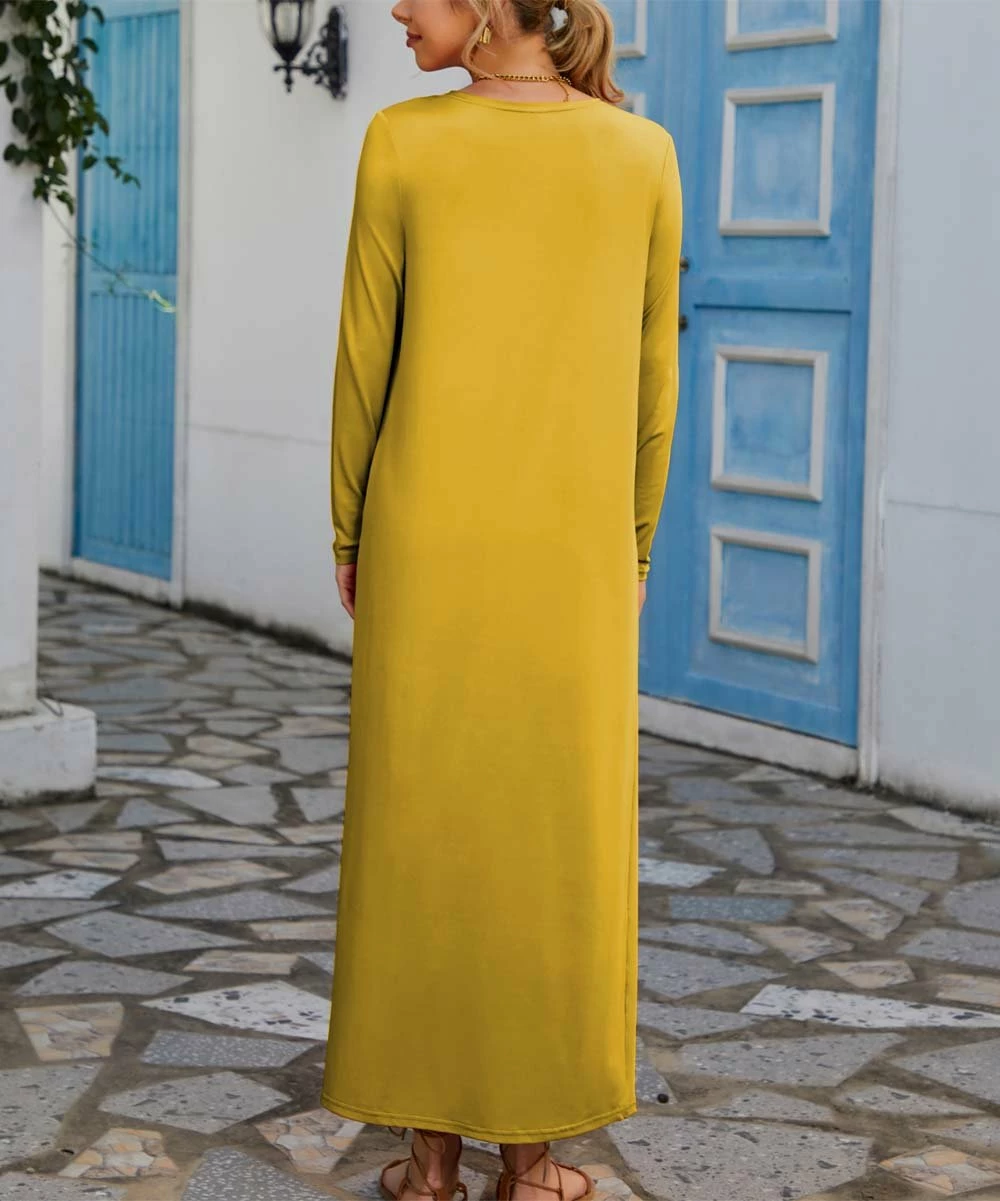 With a cozy cardigan that kisses the ground and a stretch-infused dress in complimentary colors, this outfit is elegance you can wear all day.