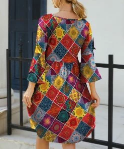 Deals π IZURIA Red & Blue Mandala Patchwork Bell-Sleeve Empire-Waist π Dress – Plus βοΈ